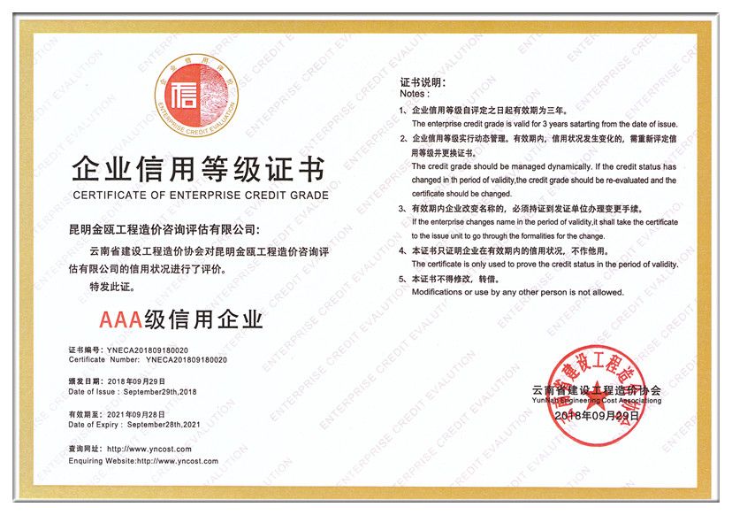 2018年9月29日,中國(guó)建設(shè)工程造價(jià)管理協(xié)會(huì)對(duì)昆明金甌工程造價(jià)咨詢(xún)?cè)u(píng)估有限公司的信用狀況進(jìn)行了評(píng)價(jià),評(píng)定金甌公司為,并頒發(fā)了“企業(yè)信用等級(jí)AAA級(jí)信用企業(yè)”級(jí)證書(shū)。