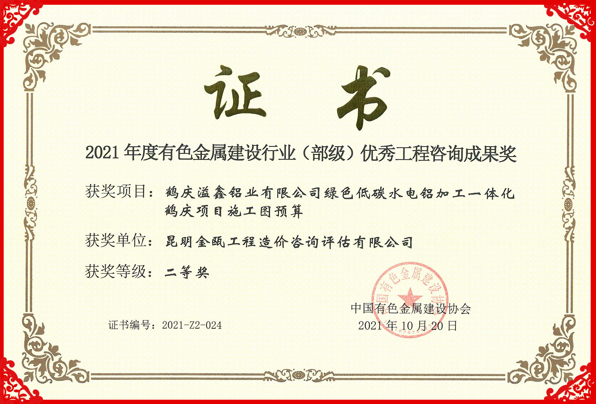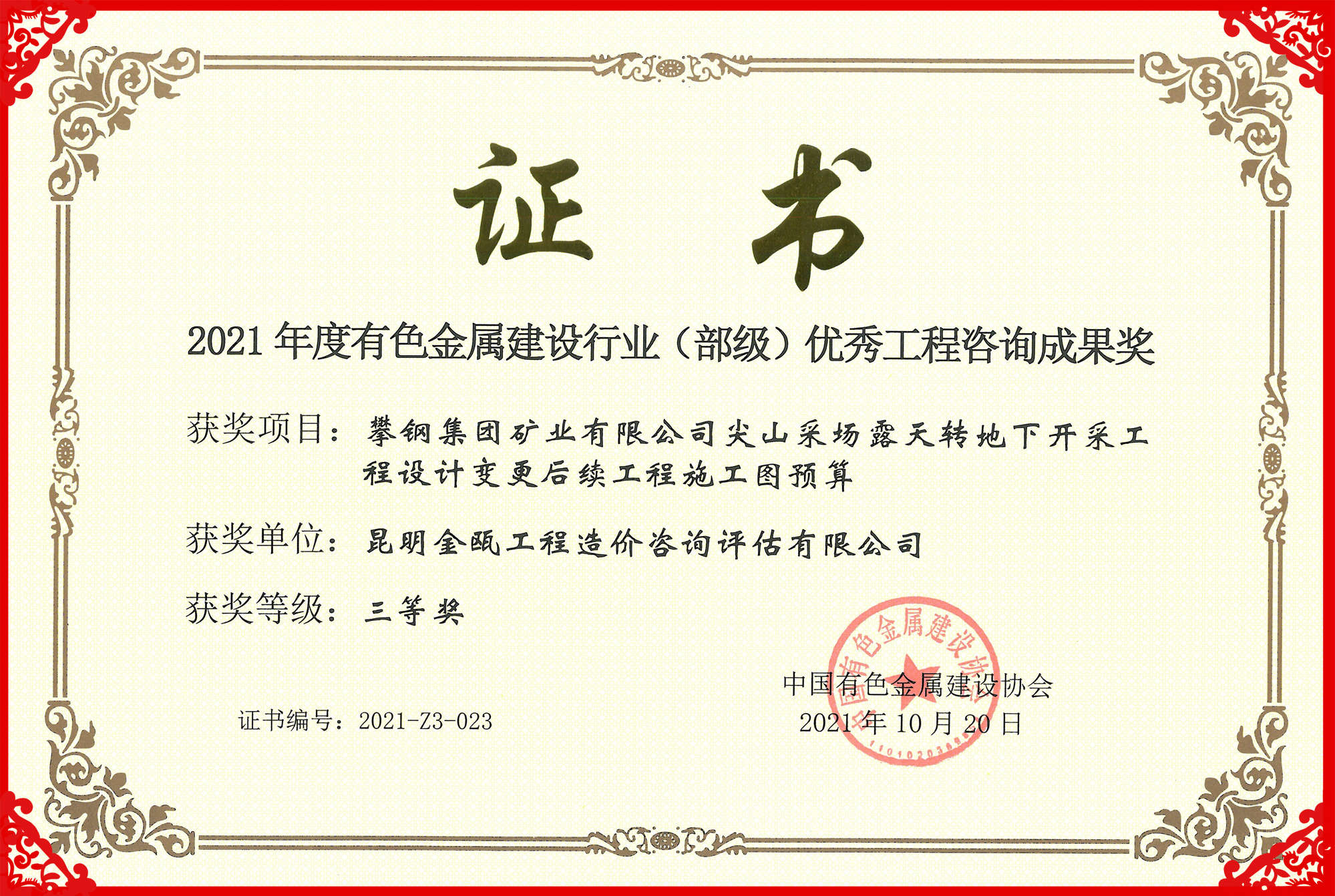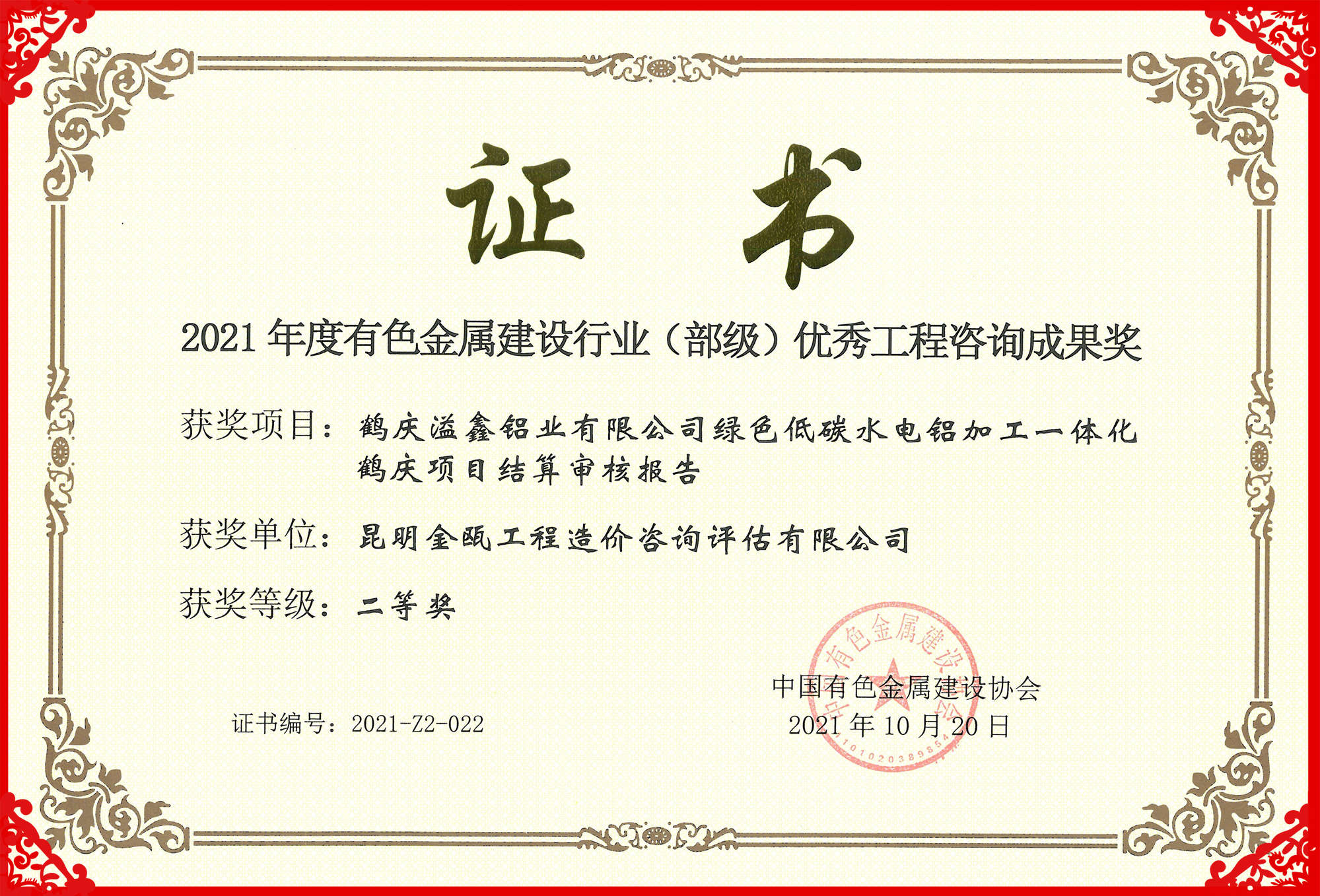 熱烈祝賀昆明金甌工程造價(jià)咨詢?cè)u(píng)估有限公司在2021年度中國(guó)有色金屬建設(shè)行業(yè)咨詢成果評(píng)獎(jiǎng)活動(dòng)中