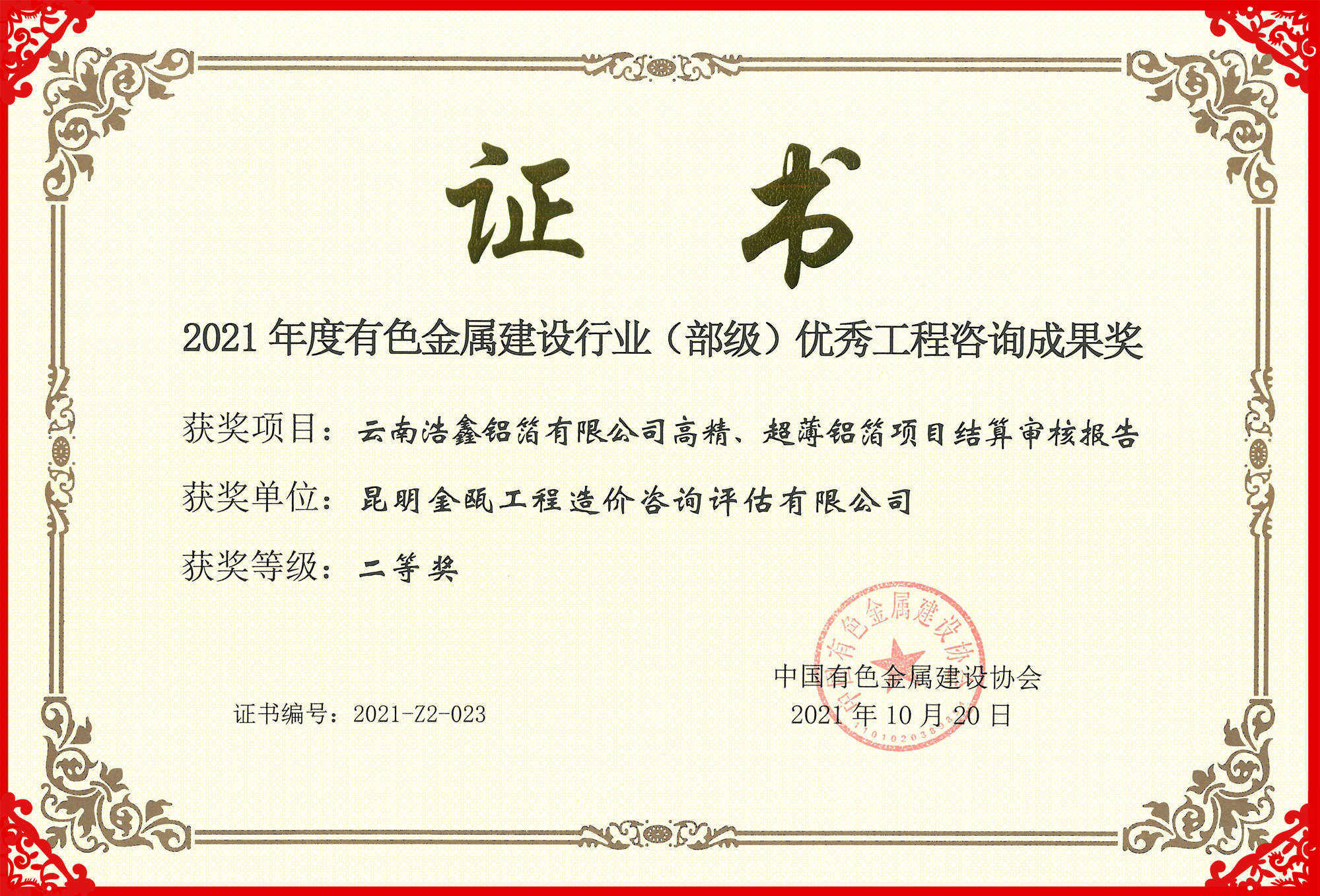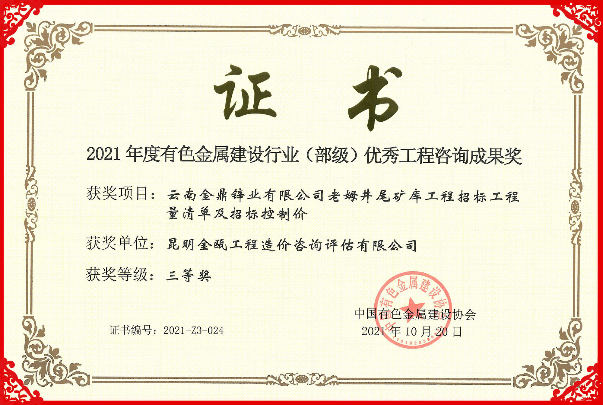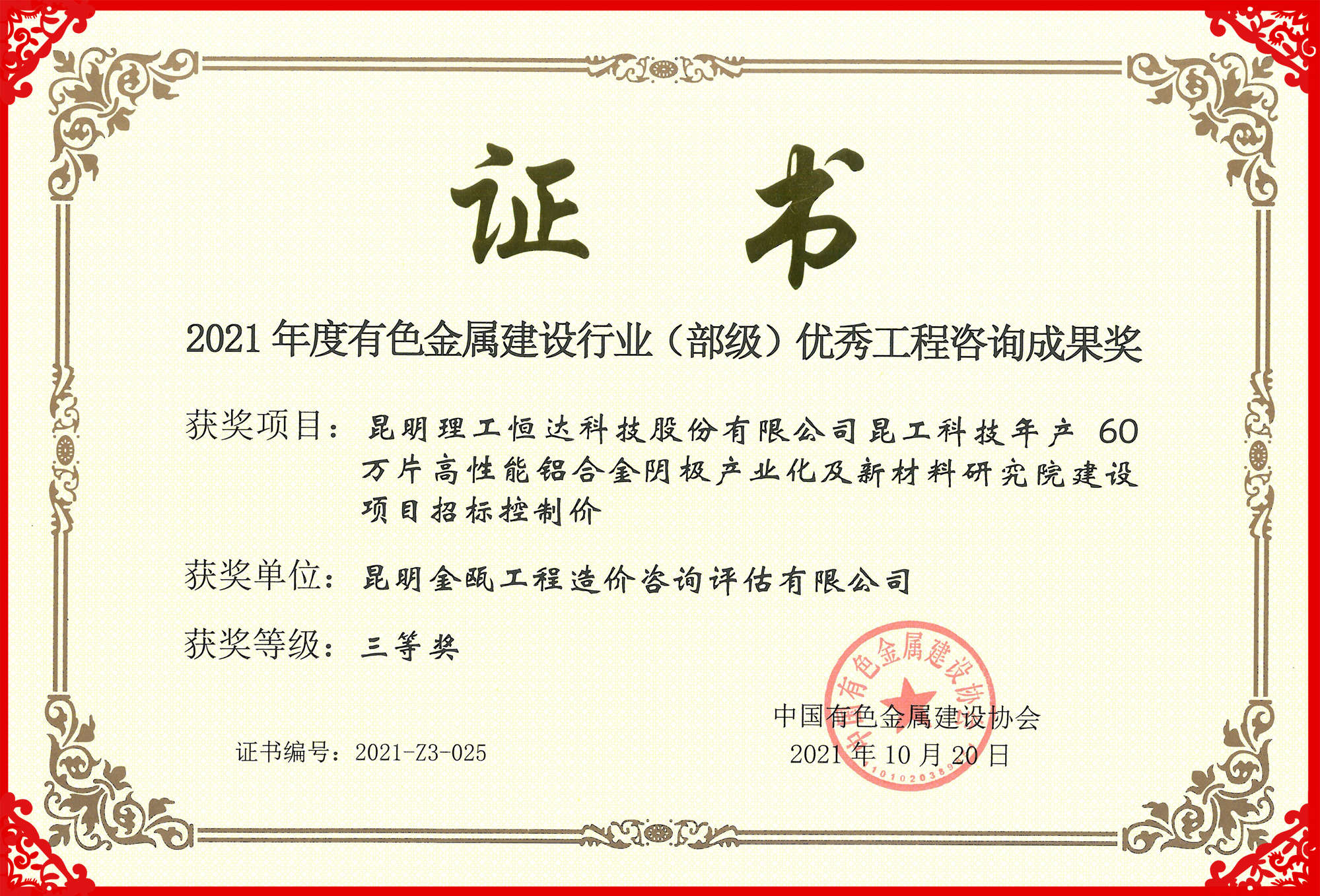 熱烈祝賀昆明金甌工程造價(jià)咨詢?cè)u(píng)估有限公司在2021年度中國(guó)有色金屬建設(shè)行業(yè)咨詢成果評(píng)獎(jiǎng)活動(dòng)中