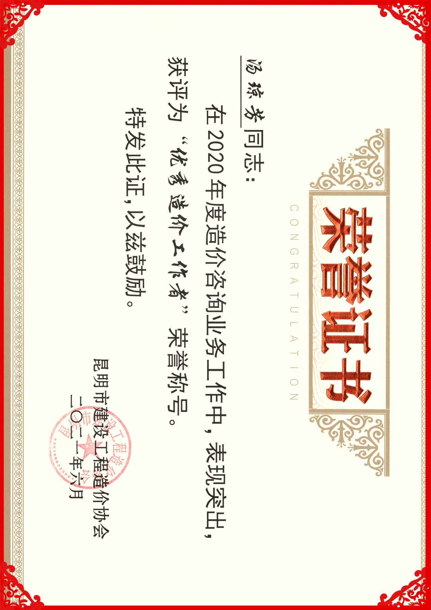 祝賀張旺、湯瓊芳同志榮獲2020年度“優(yōu)秀造價(jià)工作者”