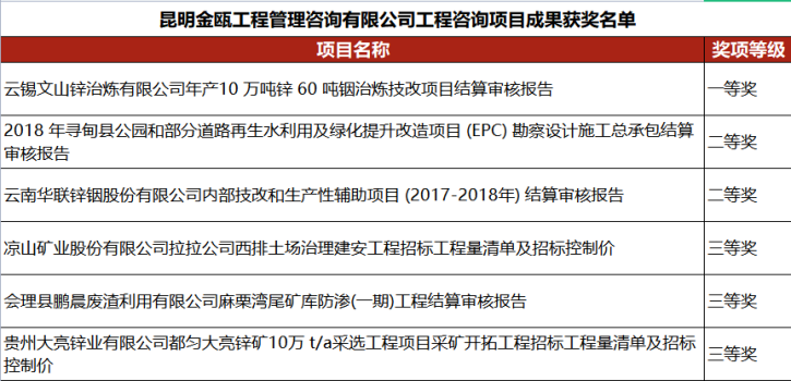 關(guān)于中國(guó)有色金屬建設(shè)協(xié)會(huì)發(fā)布《關(guān)于公布2022年度有色金屬建設(shè)行業(yè)工程咨詢(xún)、勘察、設(shè)計(jì)及信息技術(shù)成果評(píng)價(jià)結(jié)果的通知》,昆明金甌工程管理咨詢(xún)有限公司(以下簡(jiǎn)稱(chēng)昆明金甌)6項(xiàng)工程咨詢(xún)項(xiàng)目獲獎(jiǎng),其中1項(xiàng)成果為一等獎(jiǎng),2項(xiàng)成果為二等獎(jiǎng),3項(xiàng)成果為三等獎(jiǎng)。