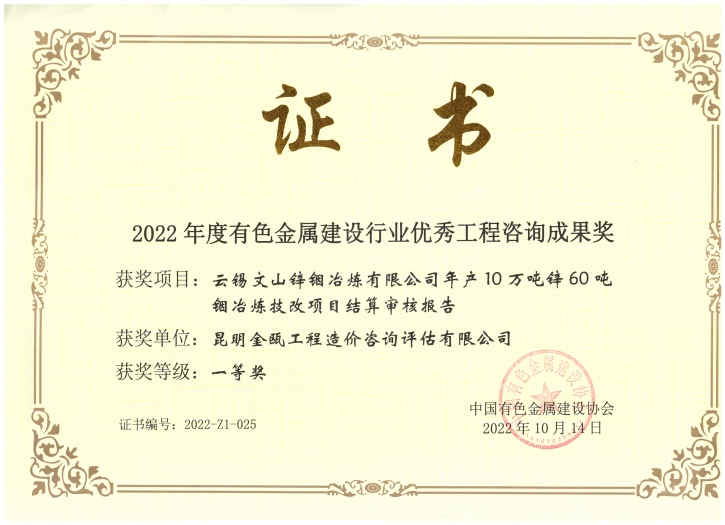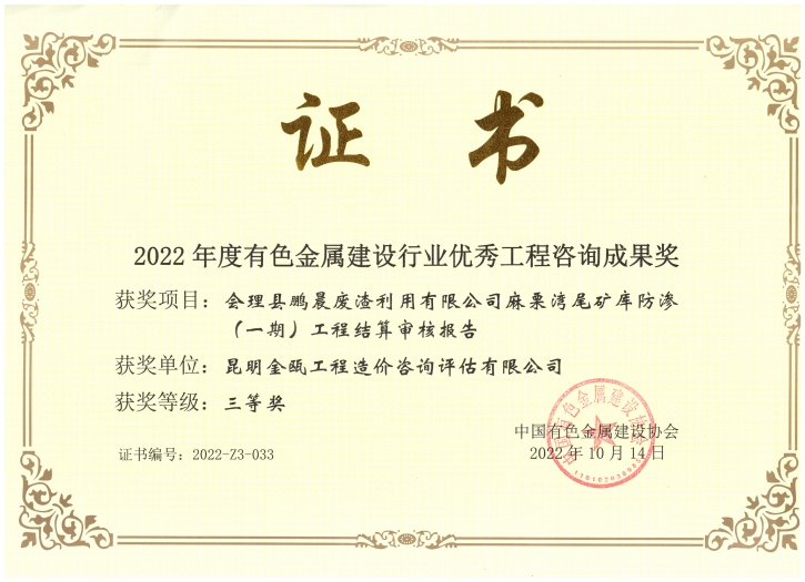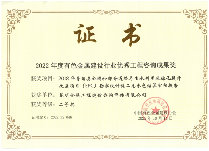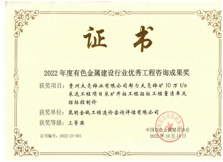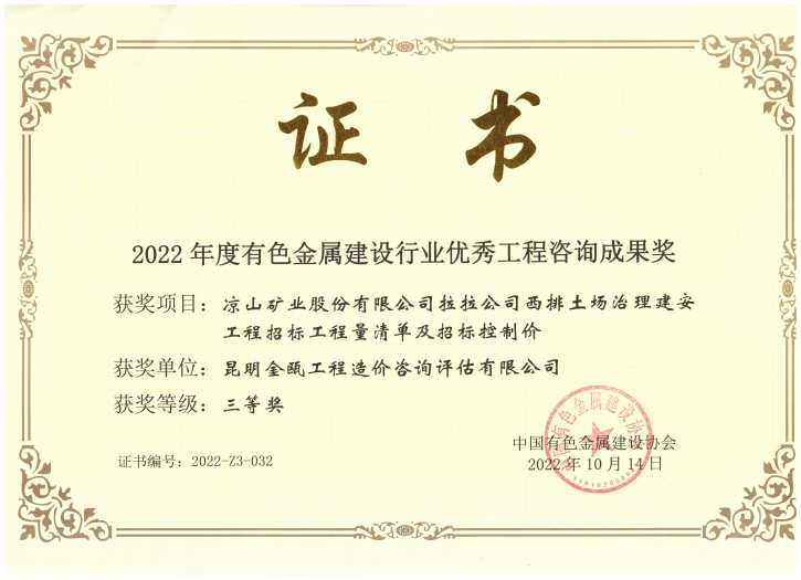 昆明金甌工程管理咨詢(xún)有限公司在2022年度有色金屬建設(shè)行業(yè)獲獎(jiǎng)情況
