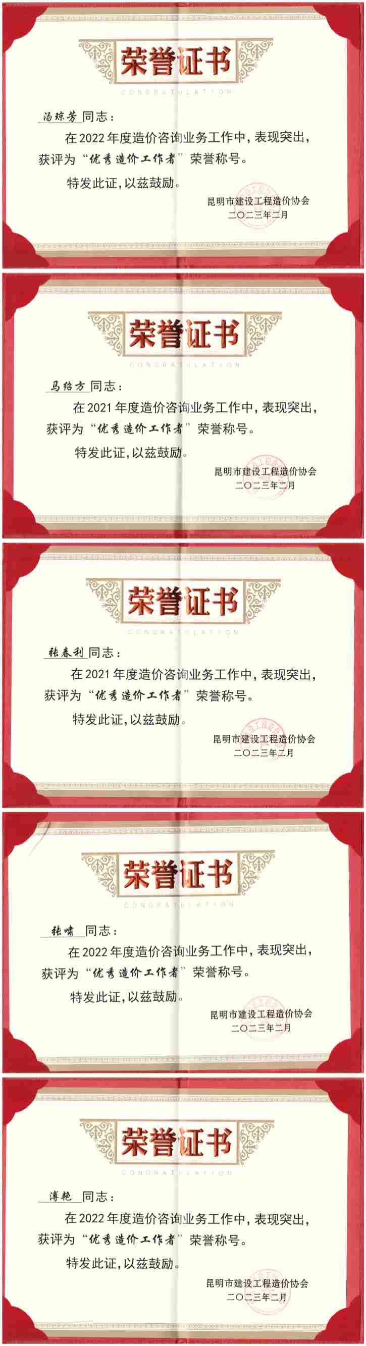 我司優(yōu)秀員工湯瓊芳、馬紹方、張春利、張嘯、溥艷在2021~2022年造價(jià)咨詢業(yè)務(wù)工作中表現(xiàn)突出,榮獲“優(yōu)秀造價(jià)工作者”榮譽(yù)稱號。