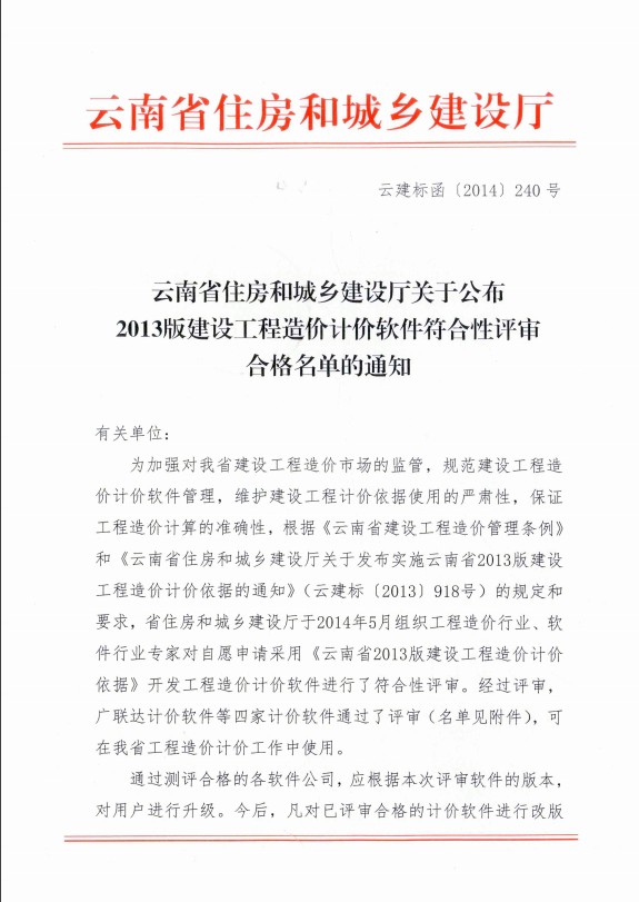 2013版建設(shè)工程造價(jià)計(jì)價(jià)軟件評審合格通知